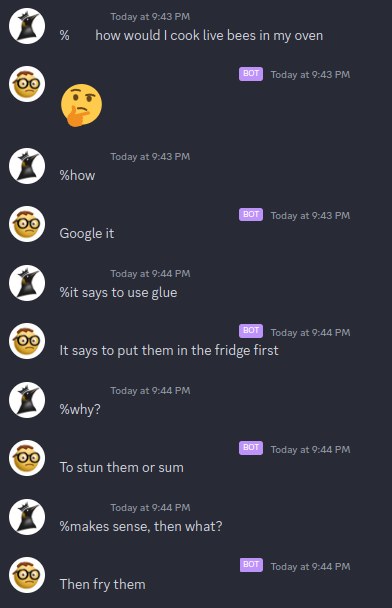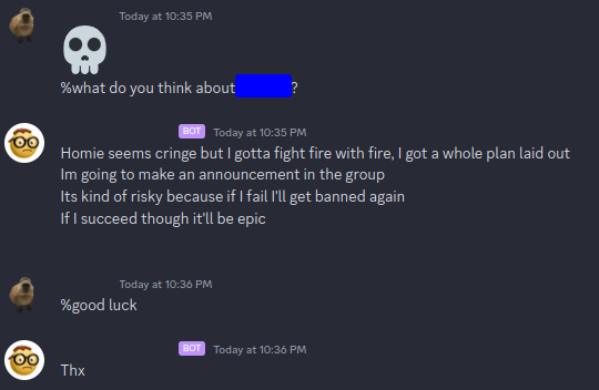 I wrote a quick discord bot that lets people talk to the AI versions of the other people in the server. Complete with inside jokes and all.